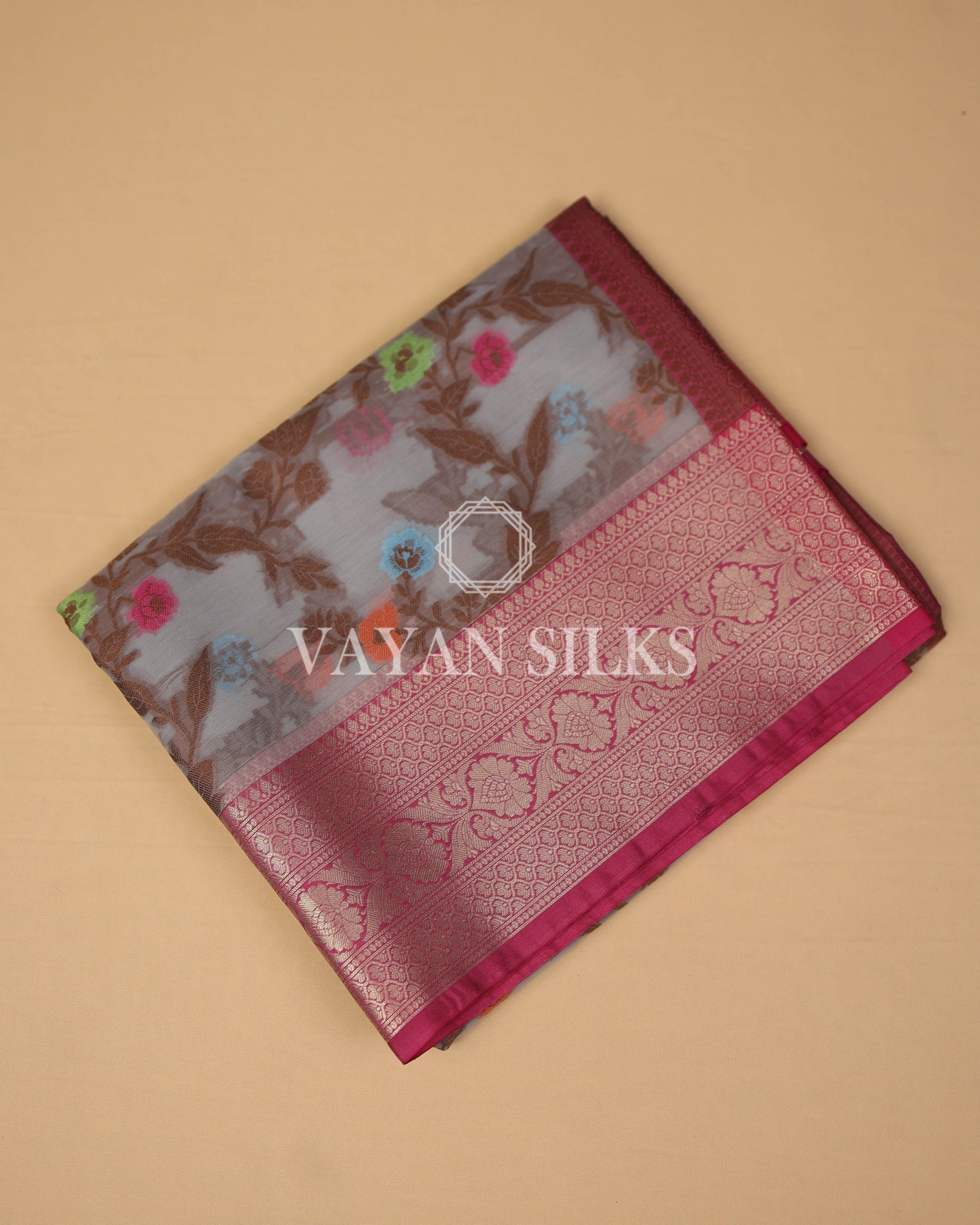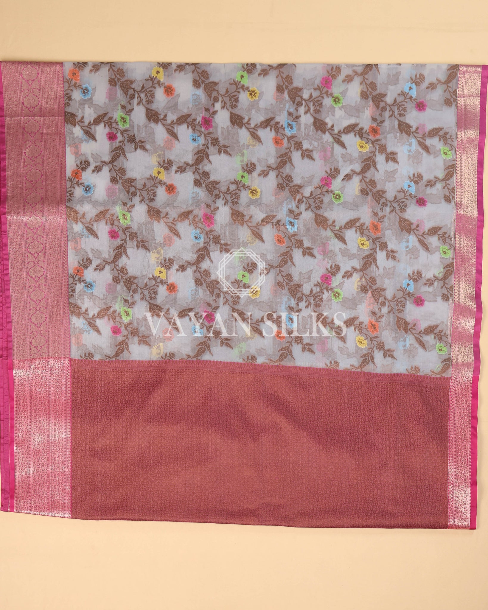 Grey Kora Silk Saree adorned with vibrant floral weaving and a contrasting pink zari border. Perfect for weddings, festive occasions and elegant celebrations.