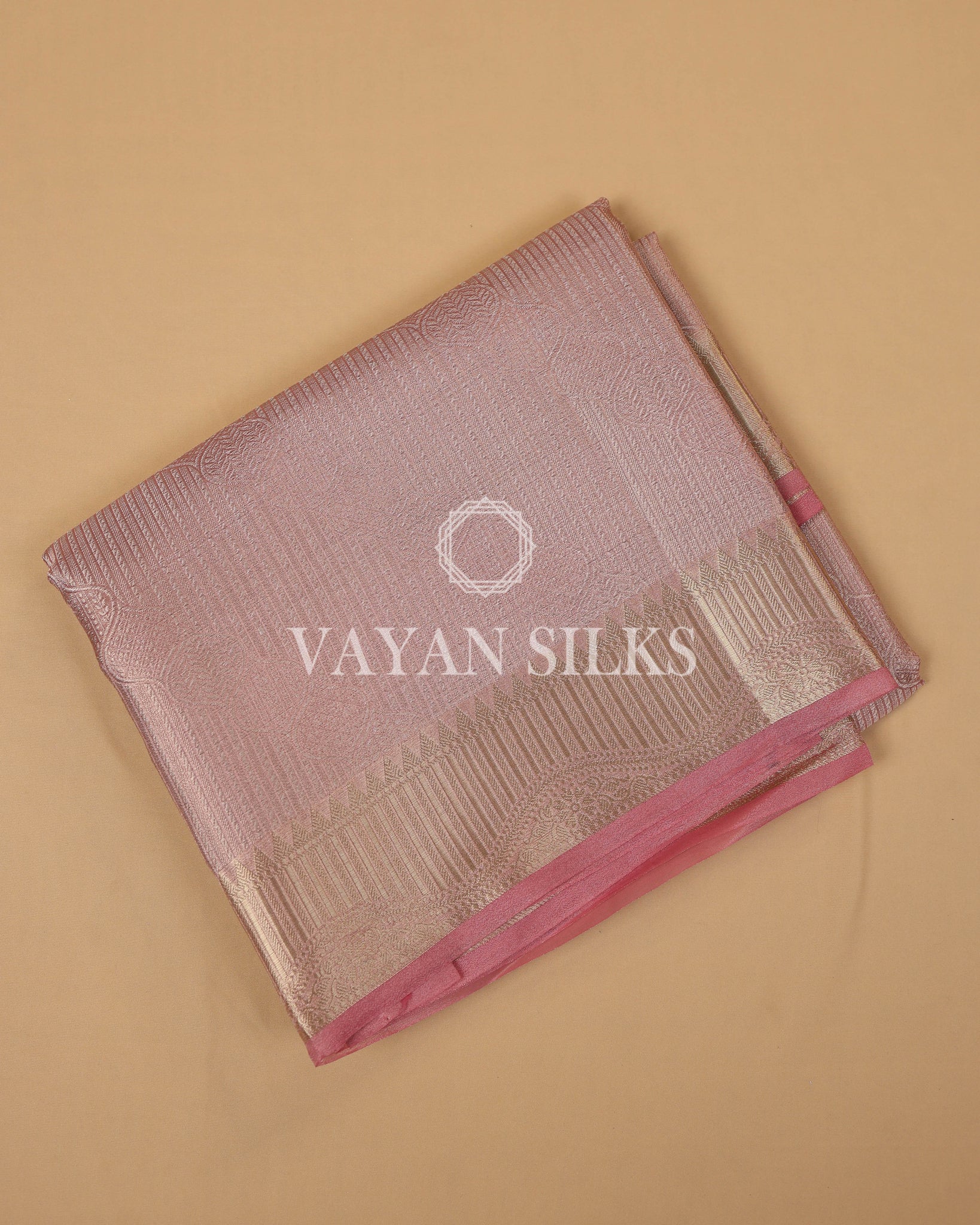 Graceful light pink Banarasi Tissue Silk Saree with intricate geometric weave, shimmering zari work and an elegant contrasting border – ideal for weddings and festive occasions.