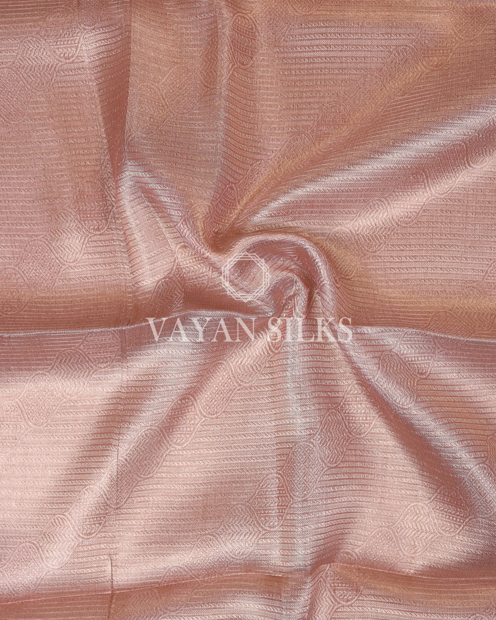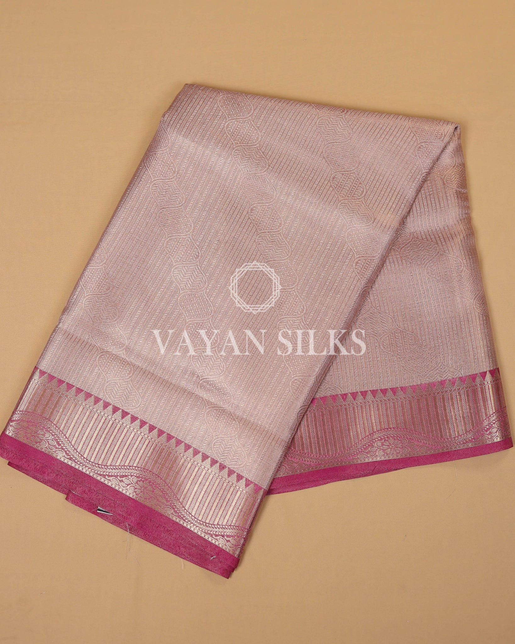 Elegant light pink Banarasi Tissue Silk Saree with subtle geometric weave, rich zari detailing and contrasting magenta border – perfect for weddings and festive occasions.