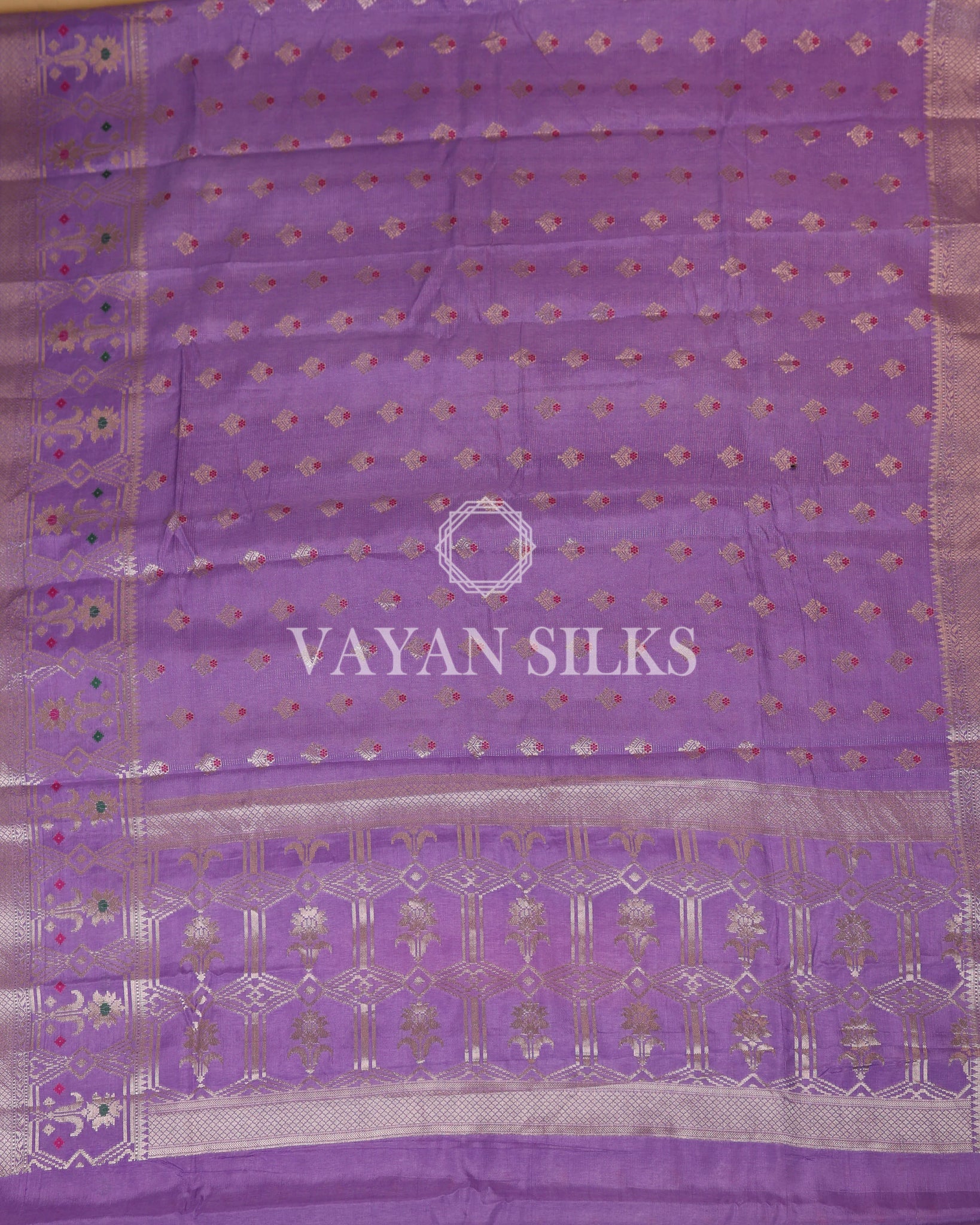 Banarasi Saree in graceful lavender with floral buttas and an intricate zari border. A perfect choice for weddings festive occasions and traditional celebrations.