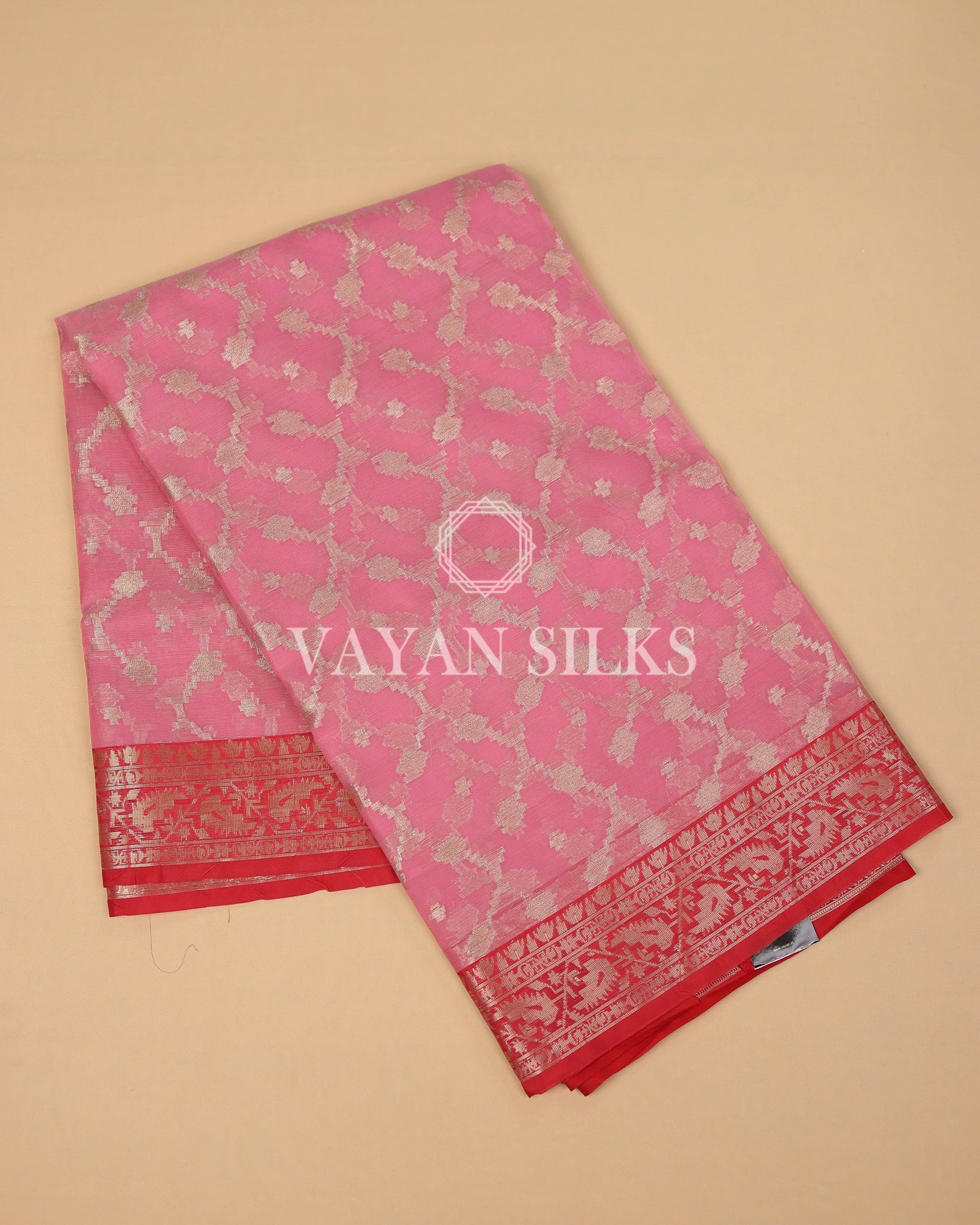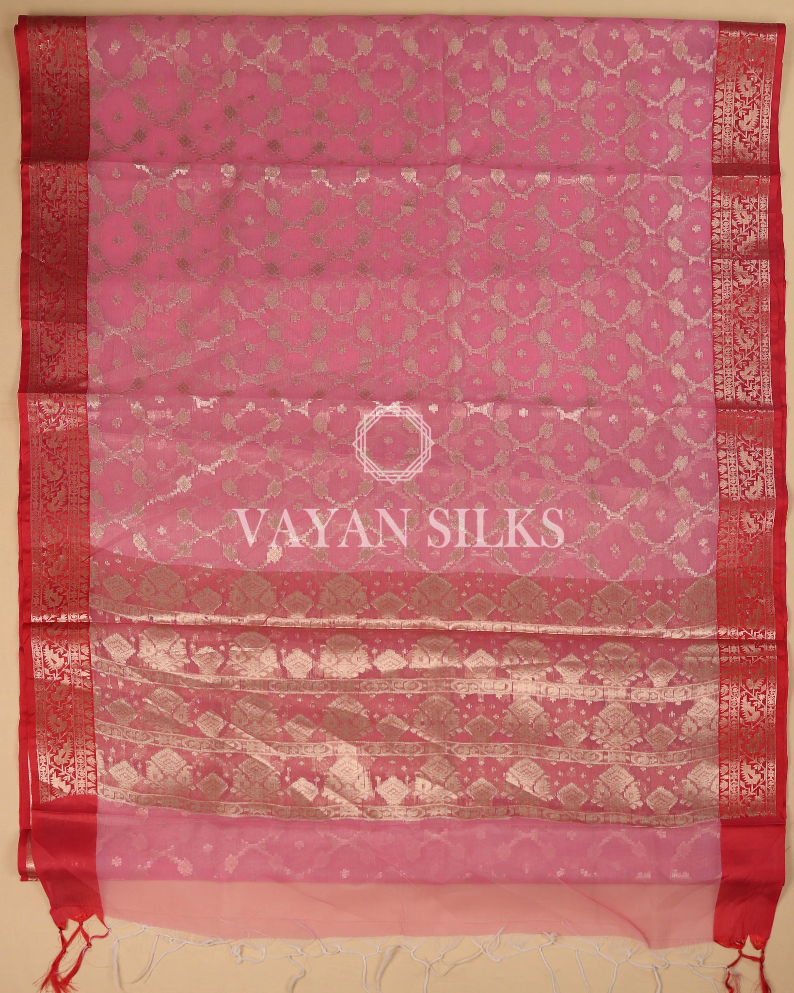 Light Pink Organza Silk Saree with red border, ideal for festive and wedding occasions.