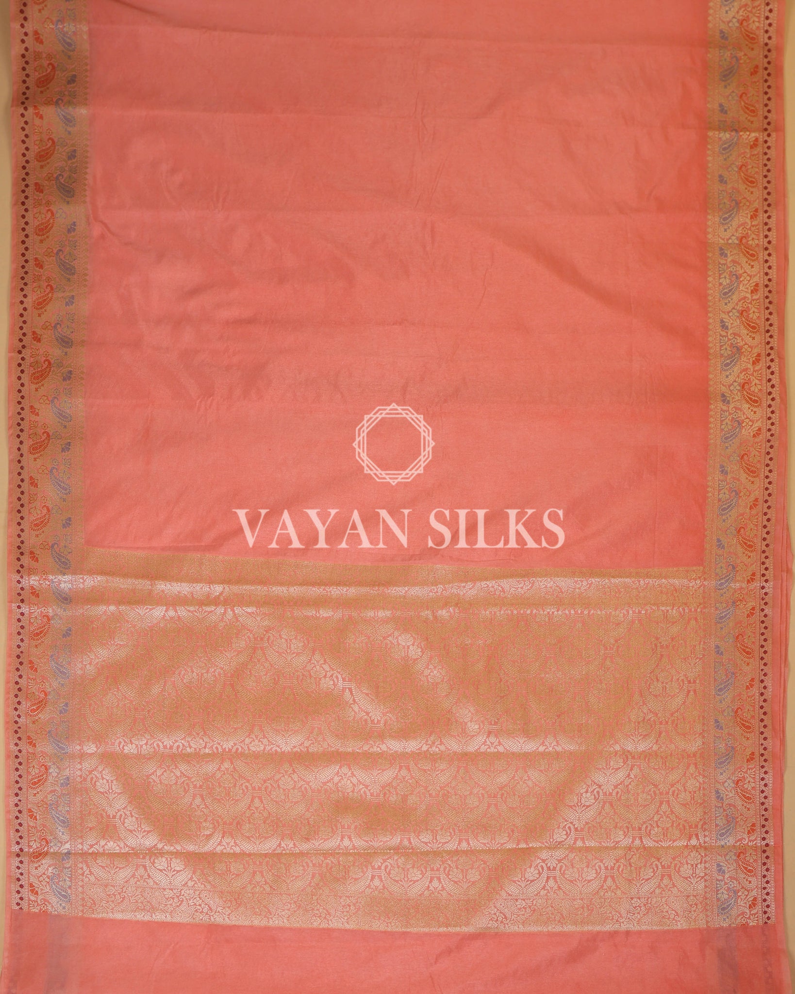 Banarasi Saree in elegant Peach with intricate paisley zari border. A timeless drape for weddings, festive occasions and traditional celebrations.