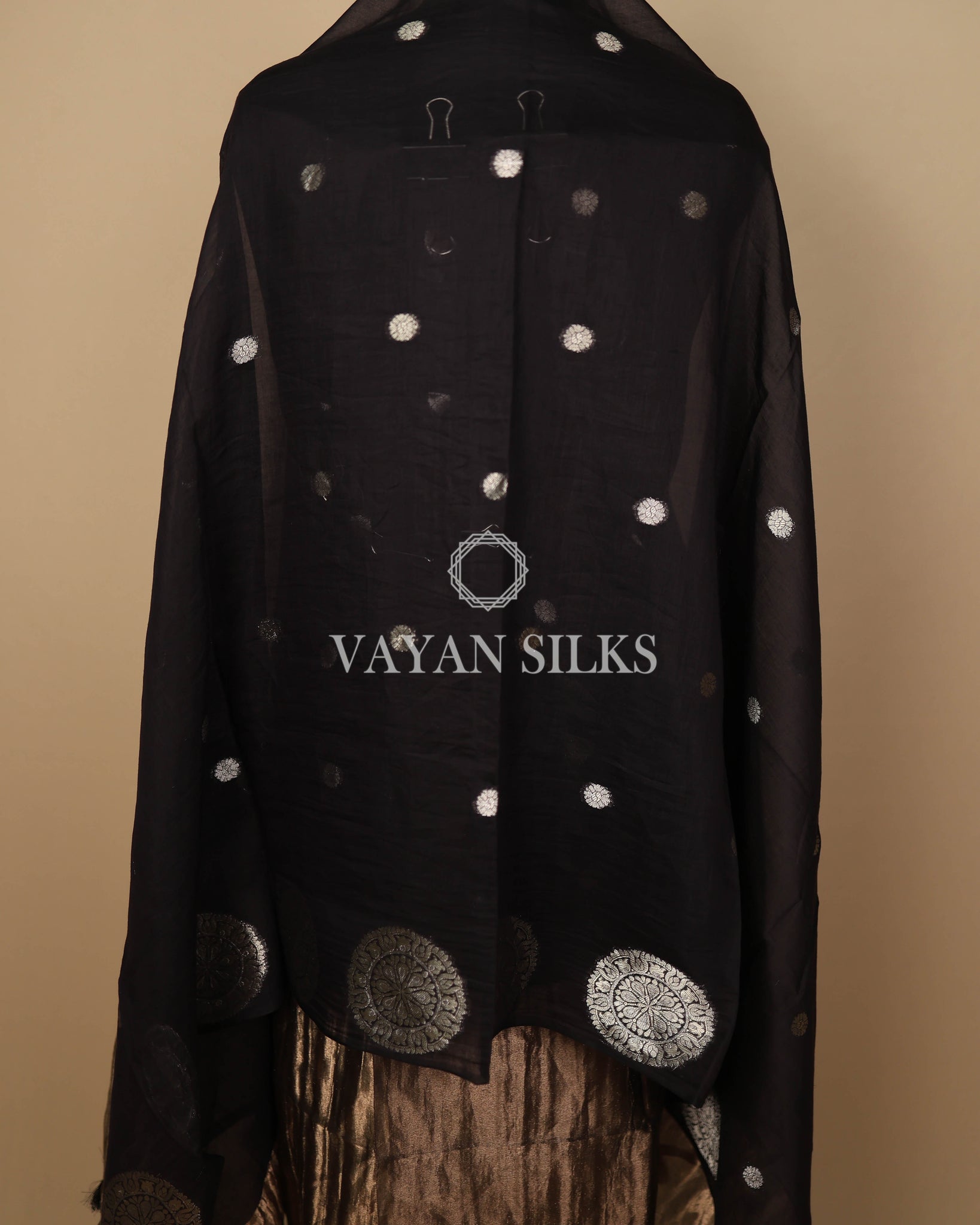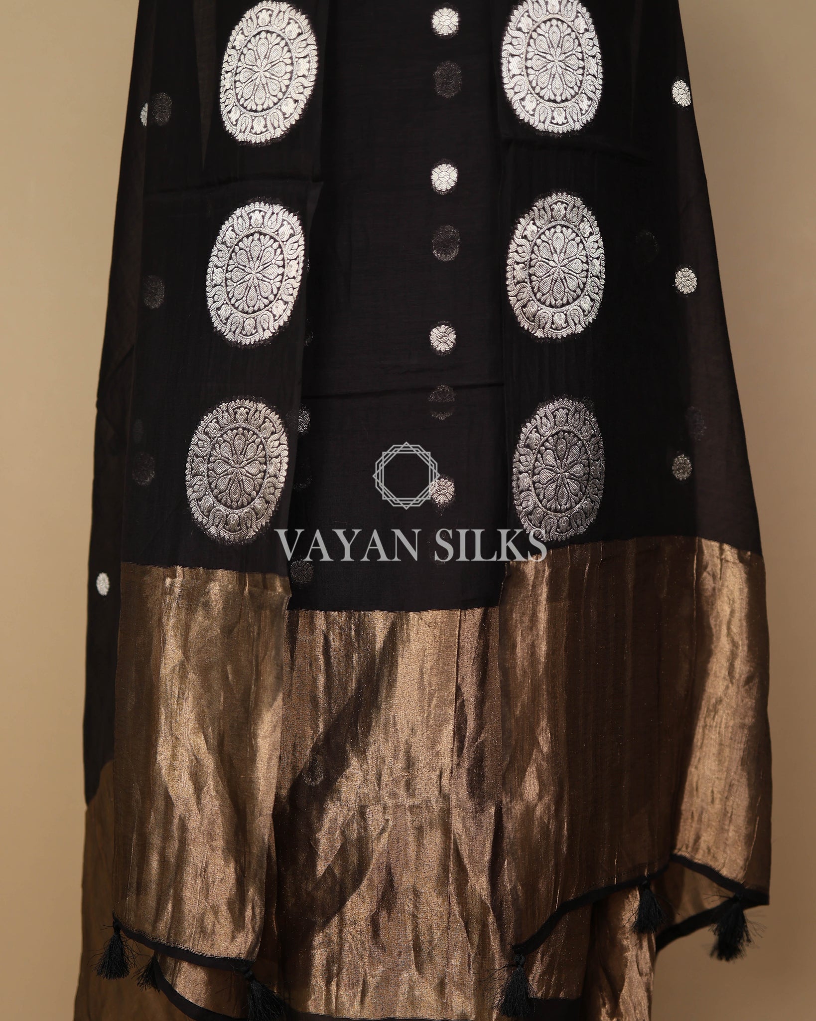 Black Banarasi Silk Weaving Suit Set crafted in rich silk with elegant woven motifs and a refined contrast border. Timeless, luxurious and perfect for traditional festive and formal occasions by Vayan Silks.