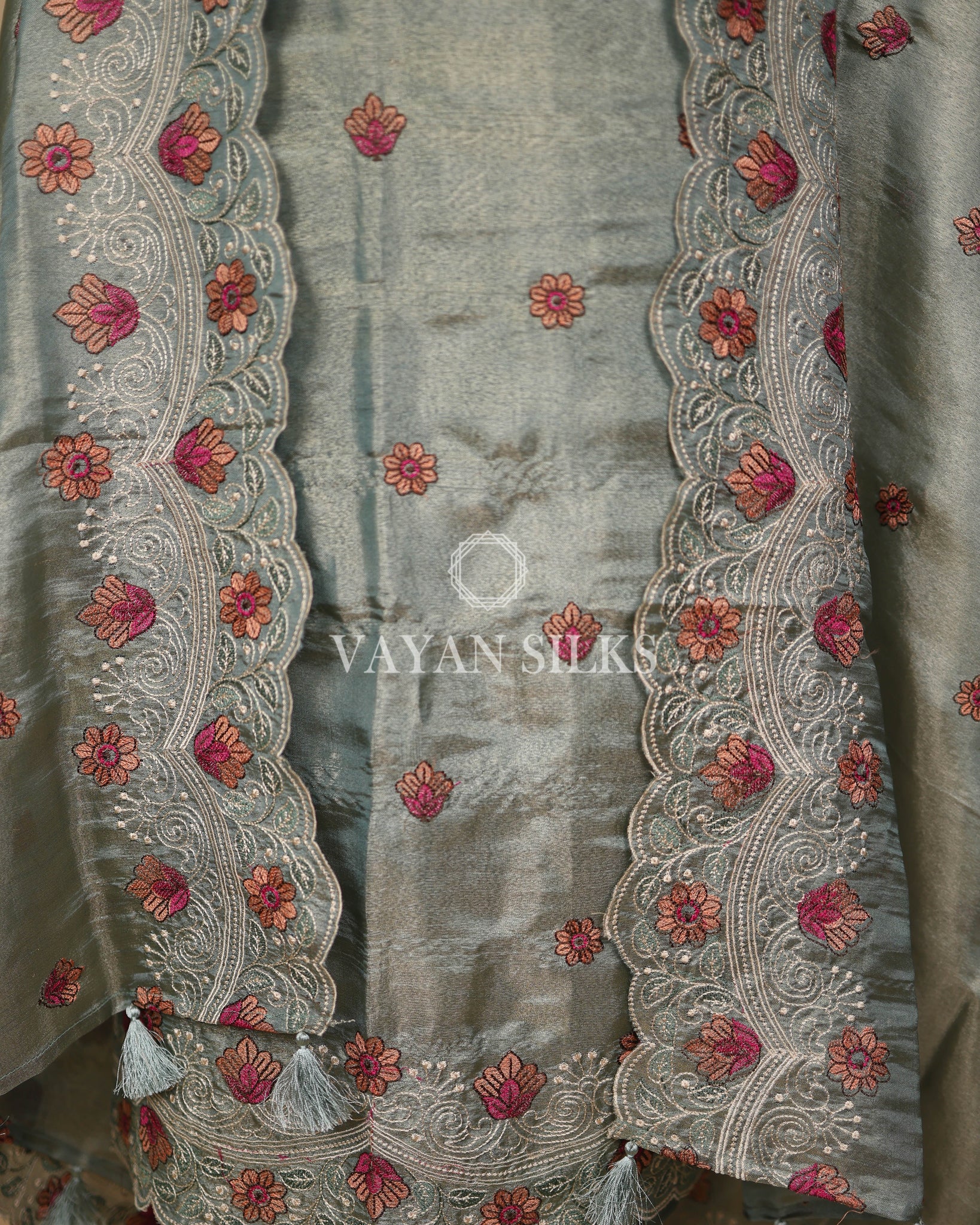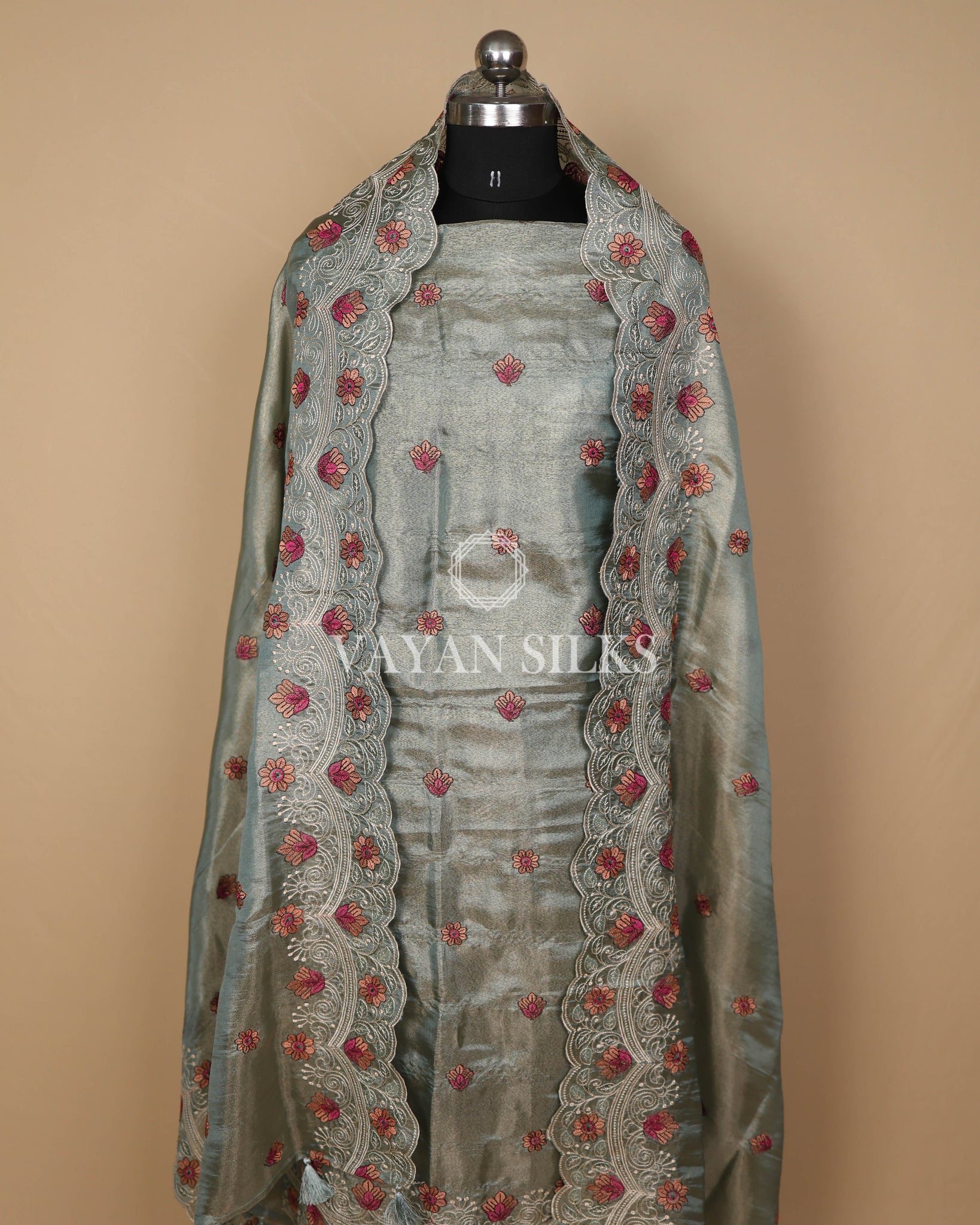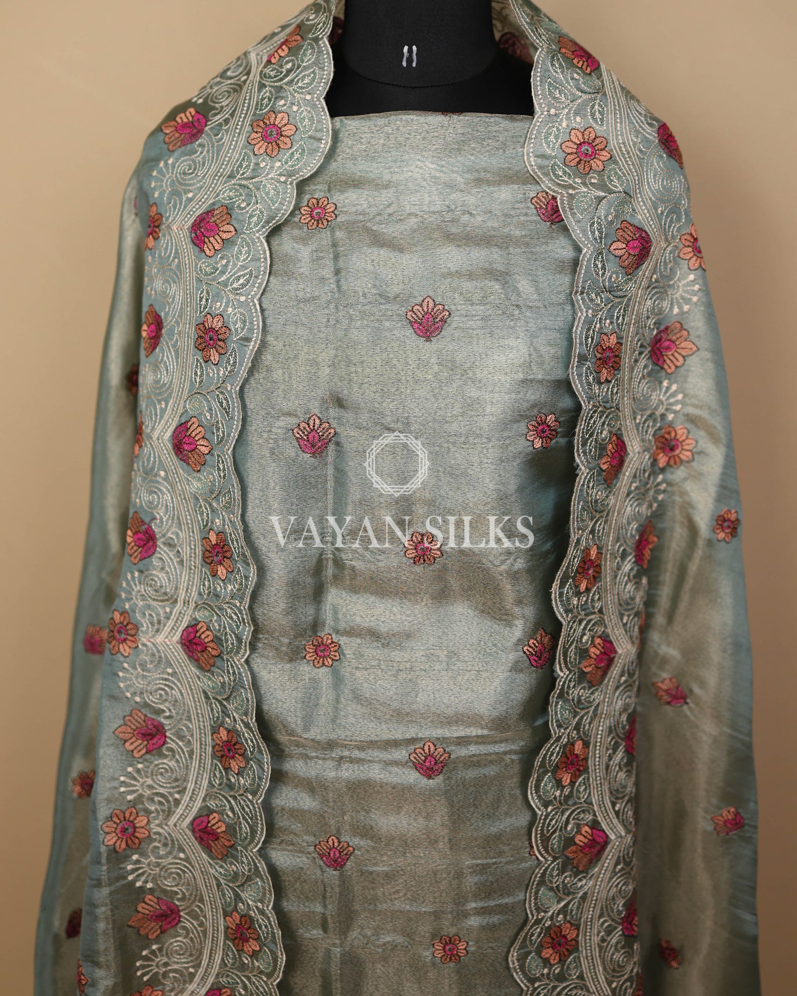 Sage Green Banarasi Shimmer Tissue Embroidered Suit Set featuring delicate floral embroidery, a soft luminous finish, and an intricately detailed dupatta. Elegant, lightweight, and luxurious. Perfect for traditional festive and formal occasions by Vayan Silks..