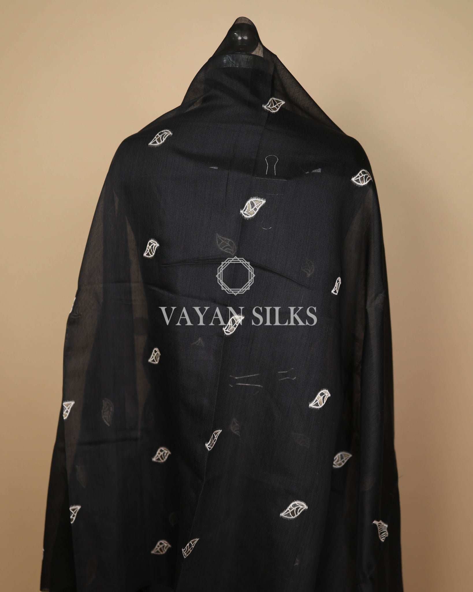Elevate your style with a classic black Banarasi silk suit set featuring elegant woven leaf motifs and a refined border. A timeless occasion-wear ensemble by Vayan Silk.