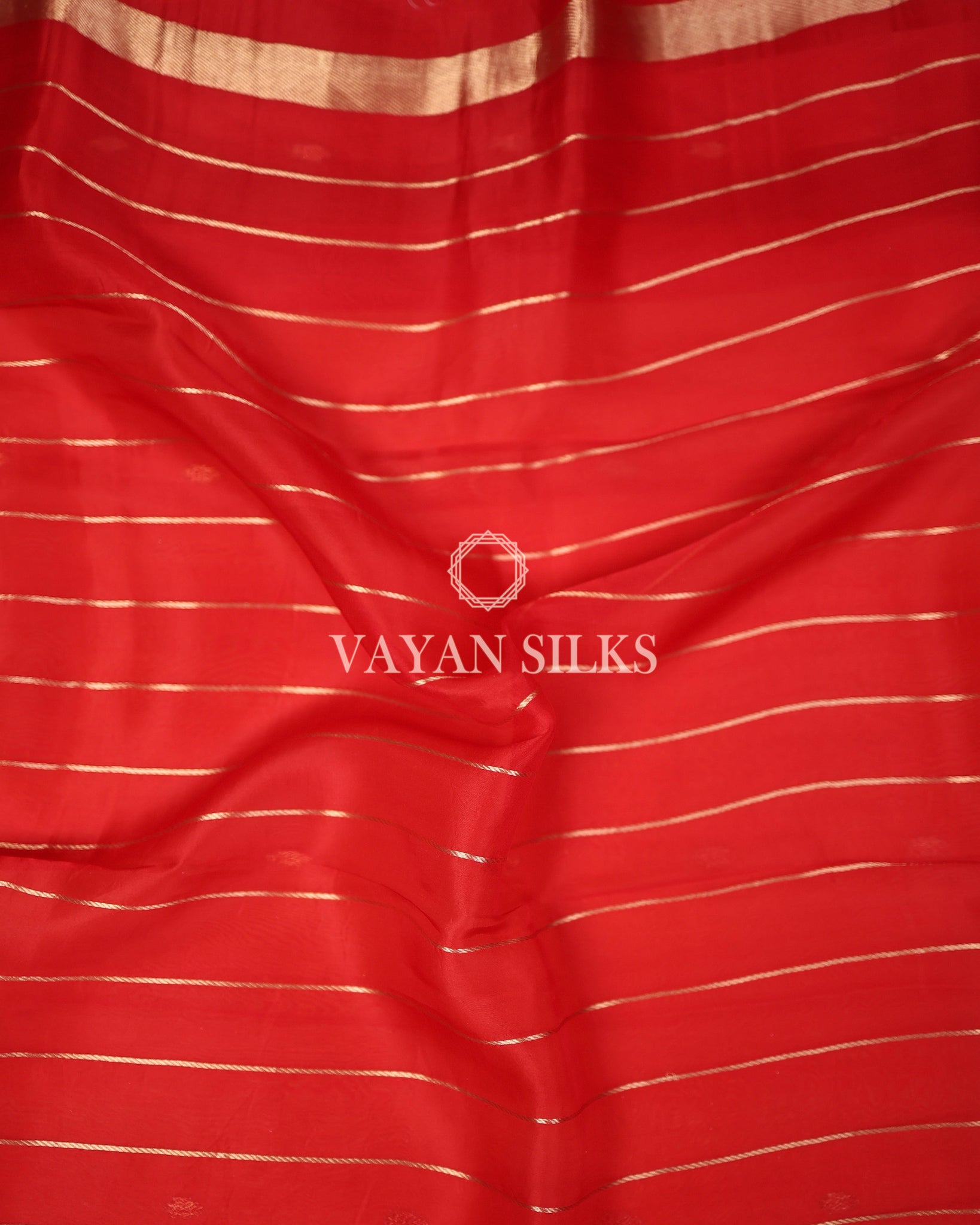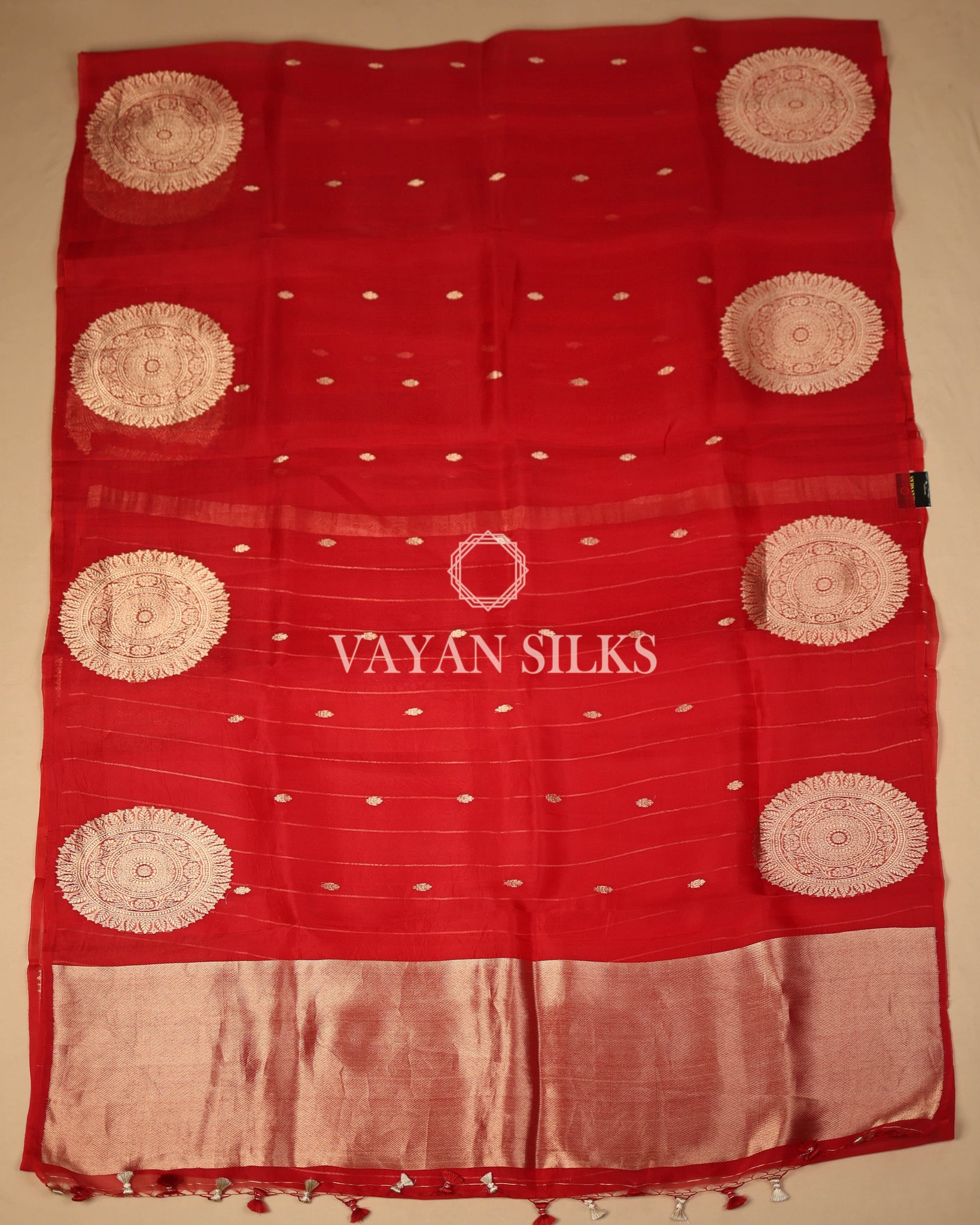 Red Banarasi pure kora silk saree adorned with elegant gold zari motifs and a lustrous finish.